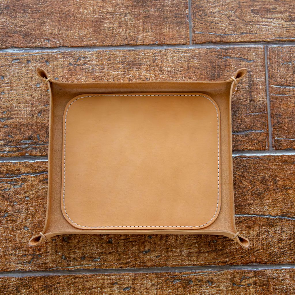 Vegetable-tanned Italian full-grain leather tray in four colors: black, brown, whiskey brown, and natural, available individually in small, medium, and large sizes or as a set of all three. Each tray features a stitched, reinforced leather base for added durability.